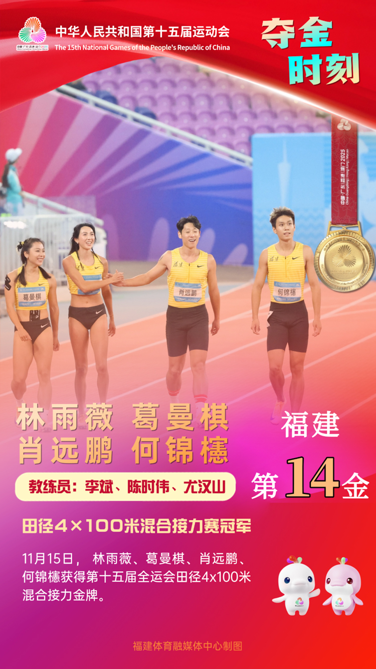 Le 15 novembre au soir, la finale du relais mixte 4×100 m des épreuves d'athlétisme des 15es Jeux nationaux s'est tenue au Centre sportif olympique du Guangdong. L'équipe du Fujian, composée notamment des athlètes de l'ECNU Ge Manqi et Lin Yuwei, a remporté la médaille d'or avec un temps de 40,37 secondes, établissant un nouveau record national et asiatique pour cette épreuve !